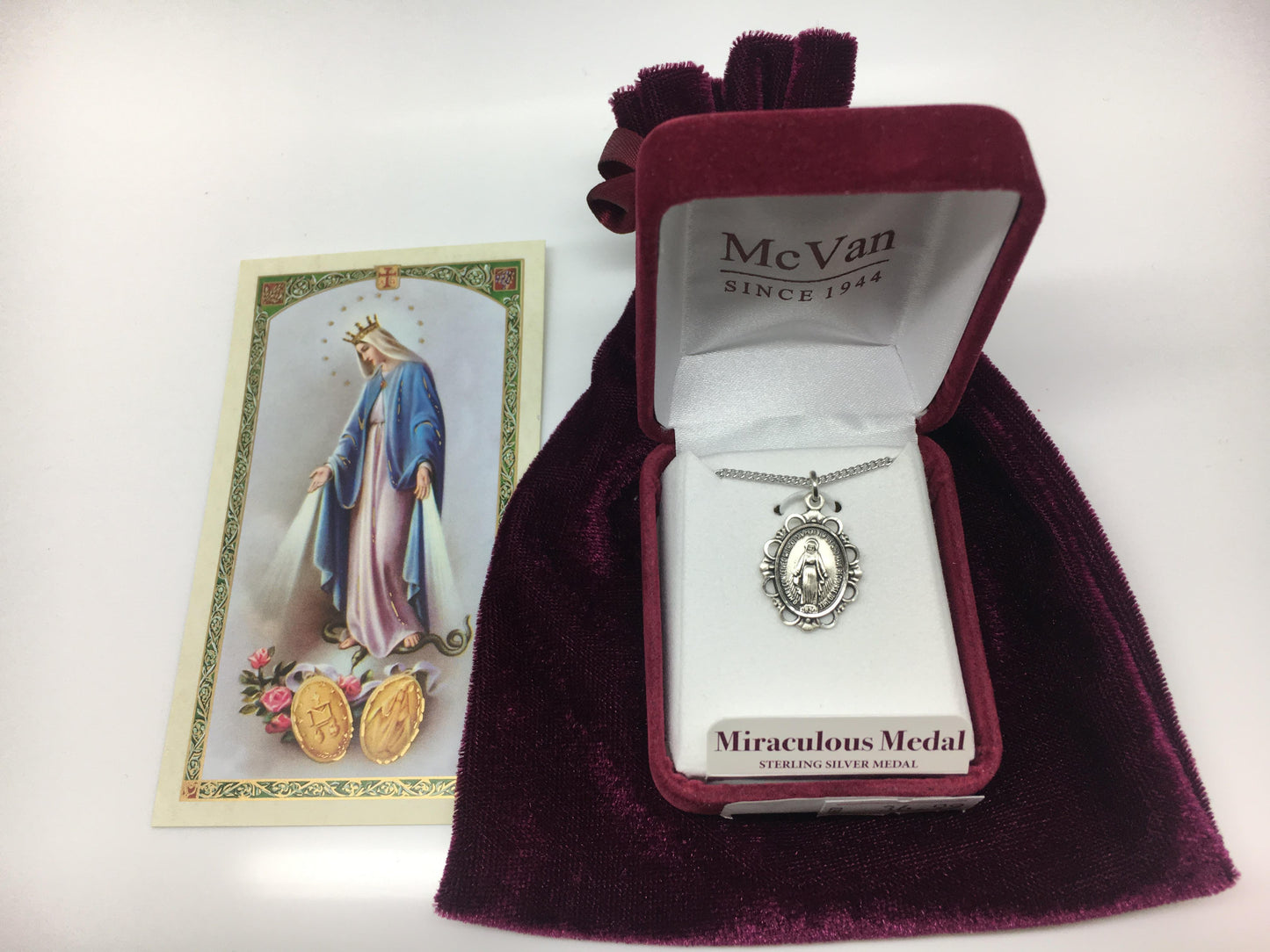 This premium Sterling Silver Miraculous Medal features a 3/4" dimension and comes with a deluxe gift box and an 18" rhodium plated chain, making it a perfect and stylish accessory. It also includes an exquisite velvet bag for safekeeping.