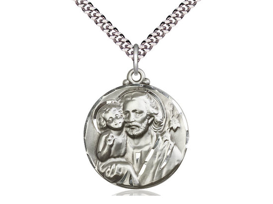 The Sterling Silver St. Joseph Medal measures 1 1/8 inches tall and 7/8 inch wide. It is crafted from high-quality sterling silver, making it a durable and meaningful keepsake. The medal comes with a 24-inch chain, providing a comfortable fit for most wearers. The chain is made of endless light rhodium-plated heavy curb links, offering a sleek and polished look. This combination of the medal and chain creates an elegant accessory for any occasion. Whether worn for spiritual or sentimental reasons, it serves as a beautiful piece of jewelry.