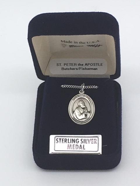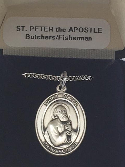 This elegant Sterling Silver St. Peter the Apostle Medal is a symbol of faith and devotion. At 3/4-inches tall and 1/2-inch wide, it features intricate detailing and comes with an 18-inch Sterling Silver Light Curb Chain. St. Peter is known as the Patron Saint of Butchers and Fisherman, making this a meaningful gift for those in these professions.