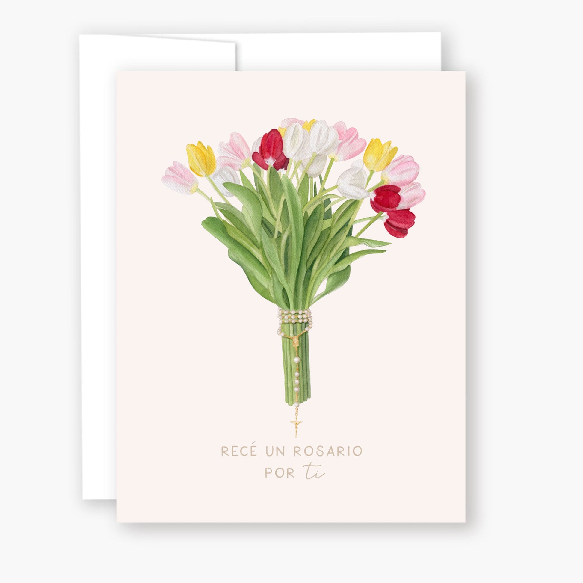 - Front of Card: Bouquet of Mixed Tulips with Rosary