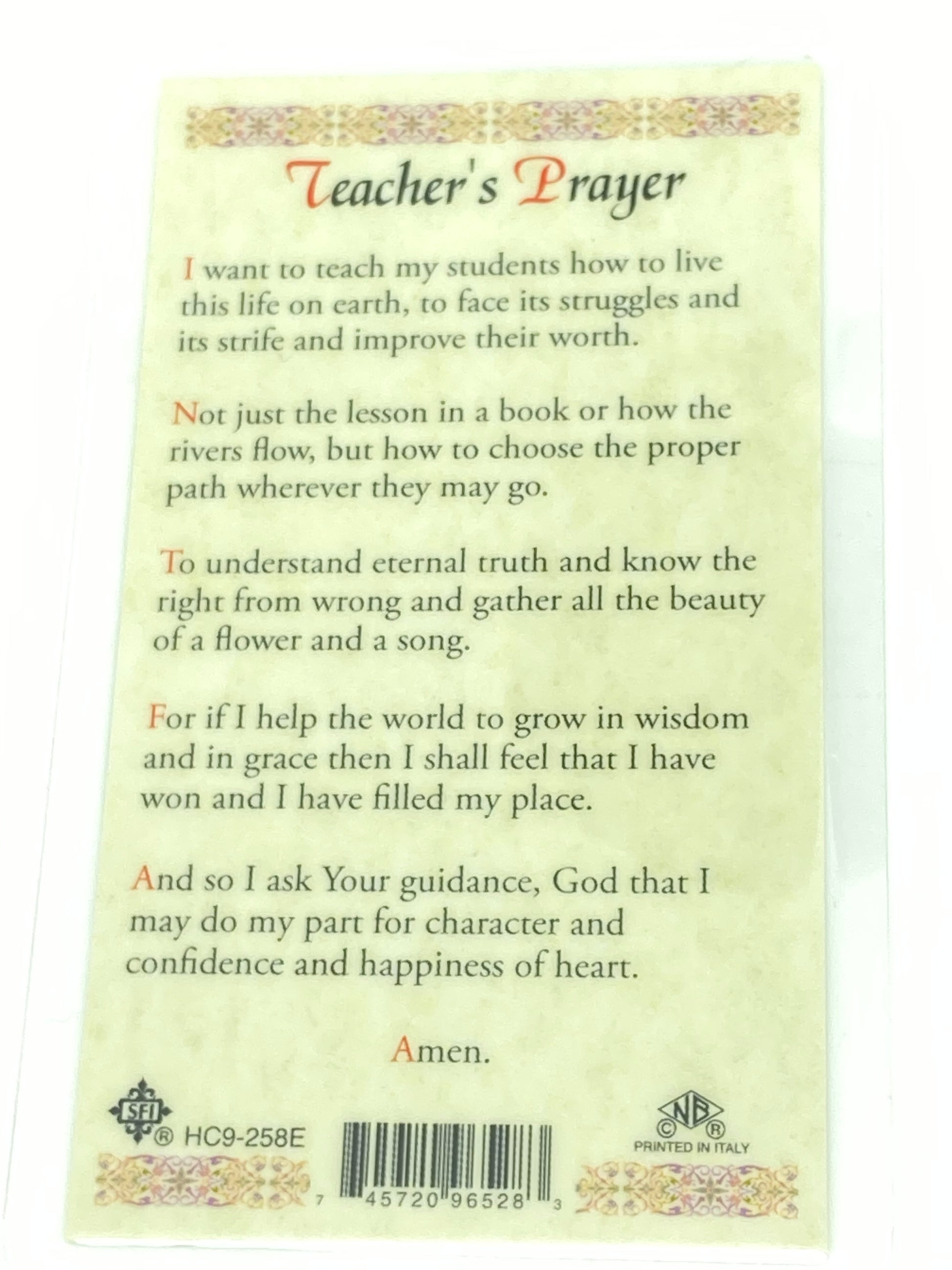 Teacher's Prayer Laminated Holy Card (Plastic Covered)
