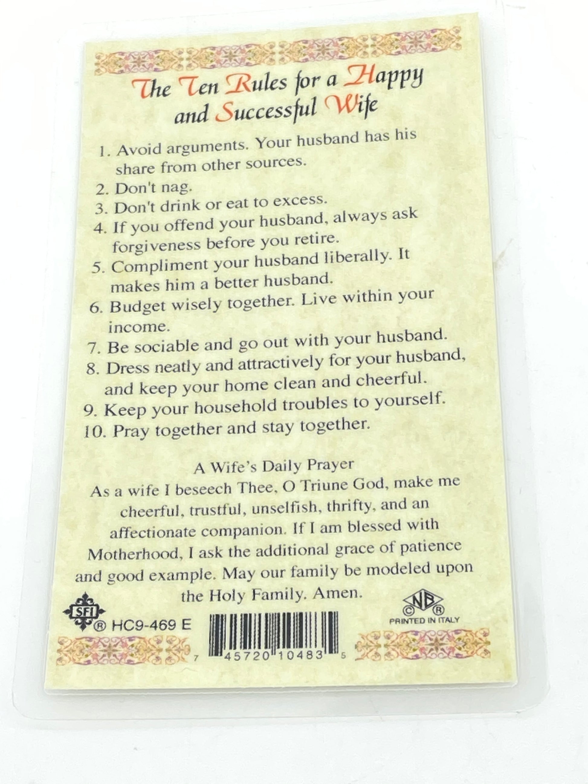 Ten Rules of a Happy and Successful Wife Laminated Holy Card (Plastic Covered)