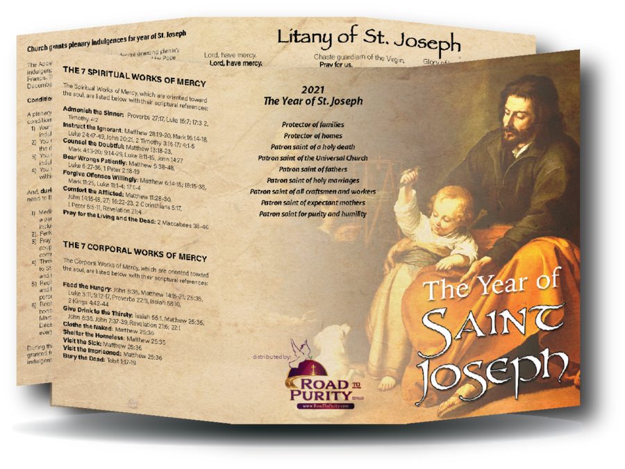 This 3-panel prayer card outlines the Apostolic Penitentiary granting plenary indulgences for the Year of St. Joseph, proclaimed by Pope Francis.