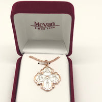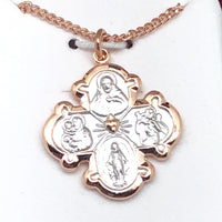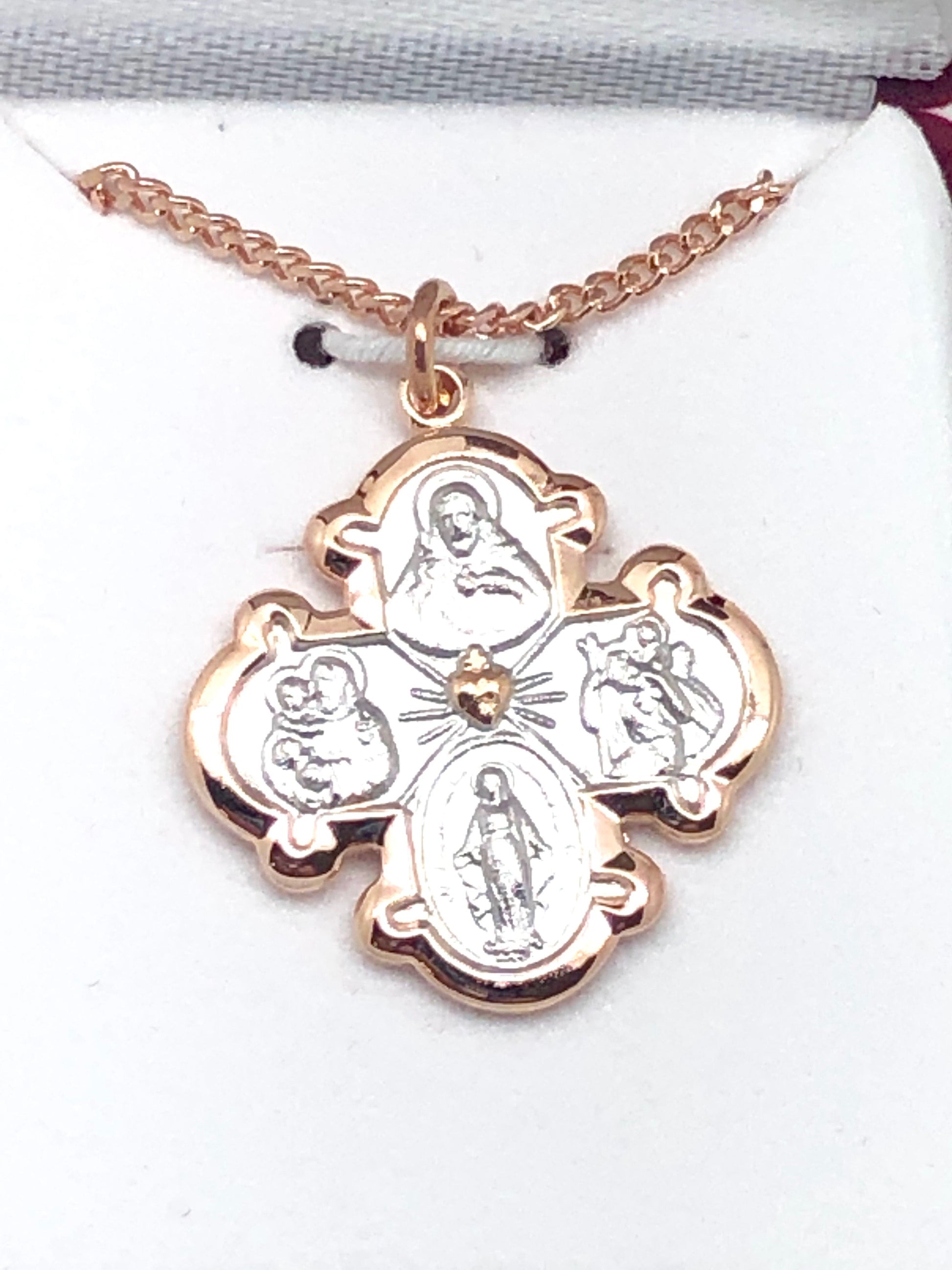 Two Tone Rose Gold and Sterling Silver 4-way medal (3/4") on 18" Gold plated chain. Comes in a red deluxe velvet gift box. Made in the U.S.A