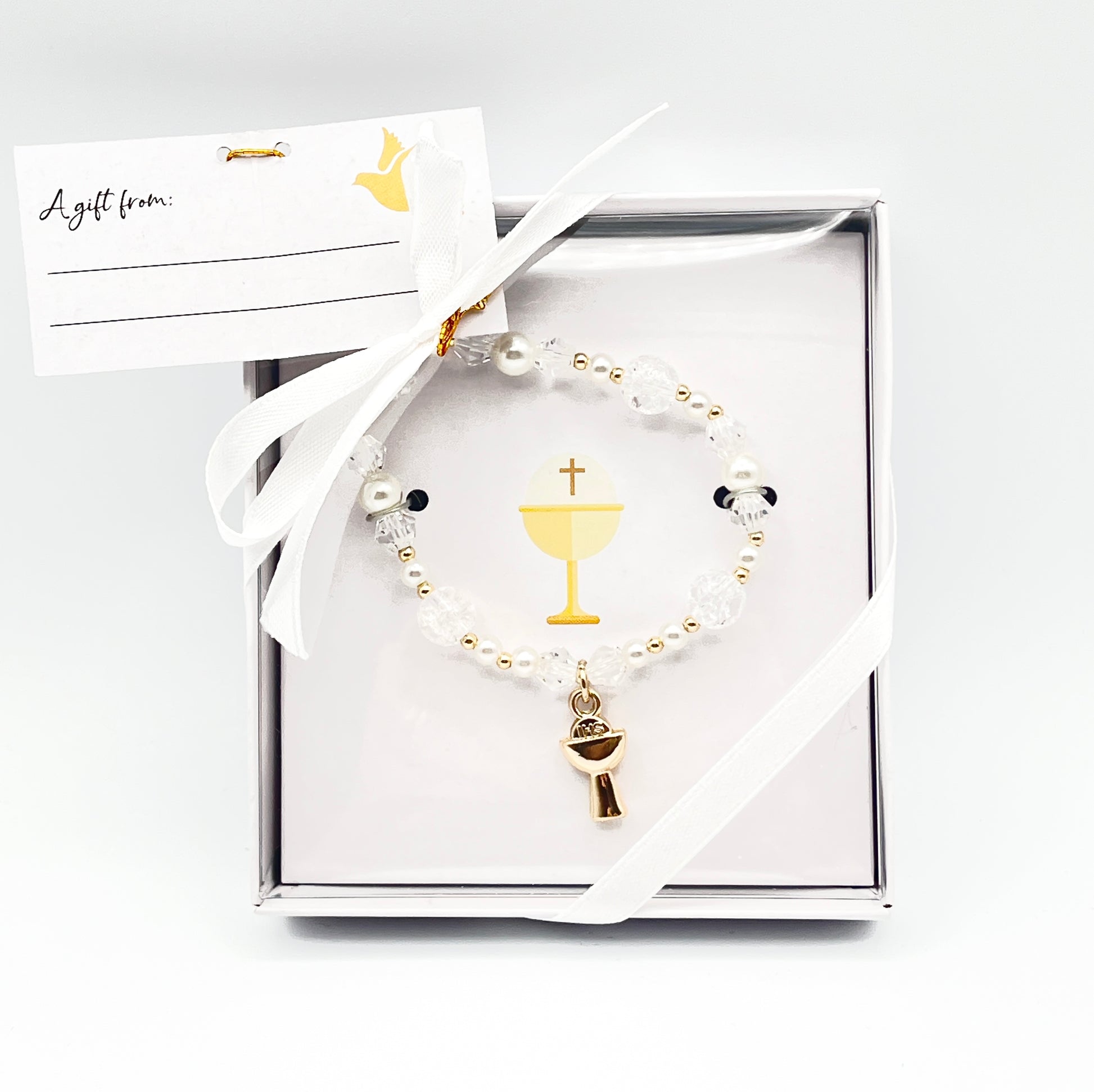 Celebrate this sacred milestone with an elegant white pearl and crystal  bracelet, specially designed for First Communion. Delicate pearls and crystal beads are paired with a meaningful gold chalice charm, symbolizing the Eucharist and spiritual devotion. Presented in a beautiful white gift box with ribbon, this keepsake piece is ready to give and treasure for years to come. A timeless addition to any young communicant's collection.
